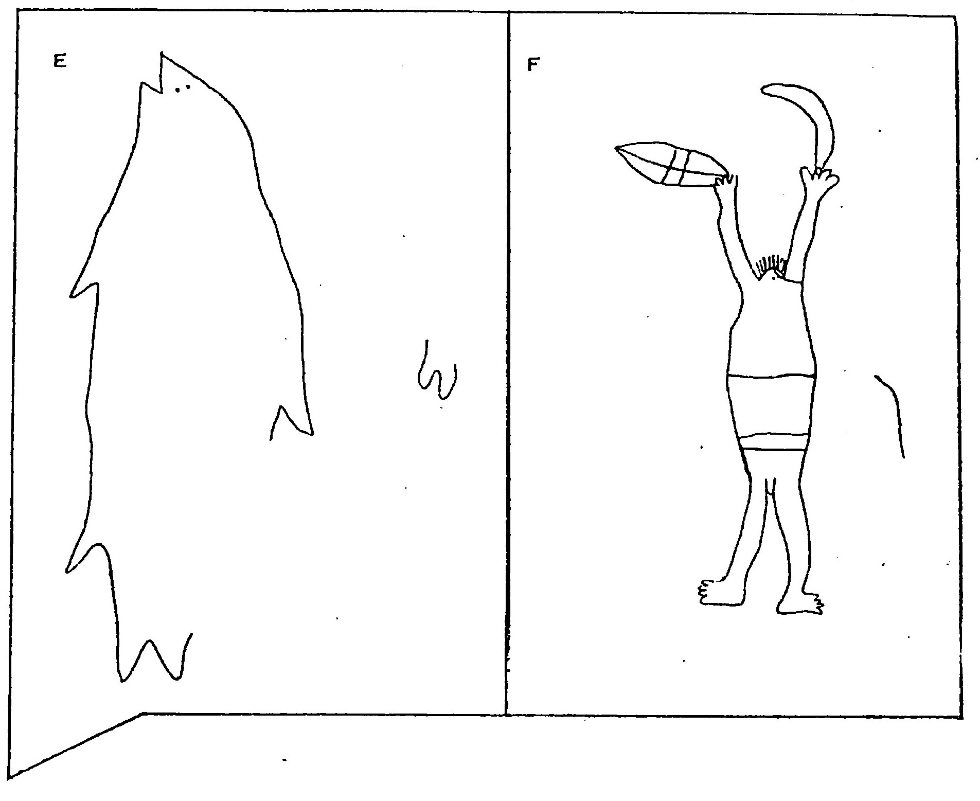 Here is engraved, facing to the east, a spirit being 7 ft 6 in high but with weapons 11 ft 9 in. Four fingers and toes are shown on the hands and feet, he is wearing several girdles, and his hair is shown. The weapons are held at the top of his outstretched and almost vertically upraised arms, the boomerang in his left hand and the shield in his right hand. There is a curved line beside him.