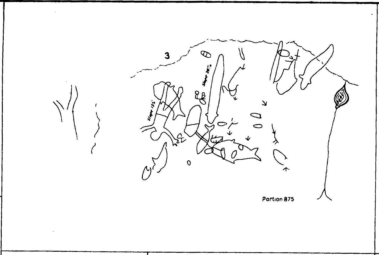 A rock where people obtained water on top of the ridge and indulged in engraving a variety of animals and tracks, and also line figures which are unique. Campbell identified the head of a 3-pronged fishing spear near the man’s legs but I cannot see it in his diagram, and also a phallic symbol which is really a bent line with a bifurcated end.