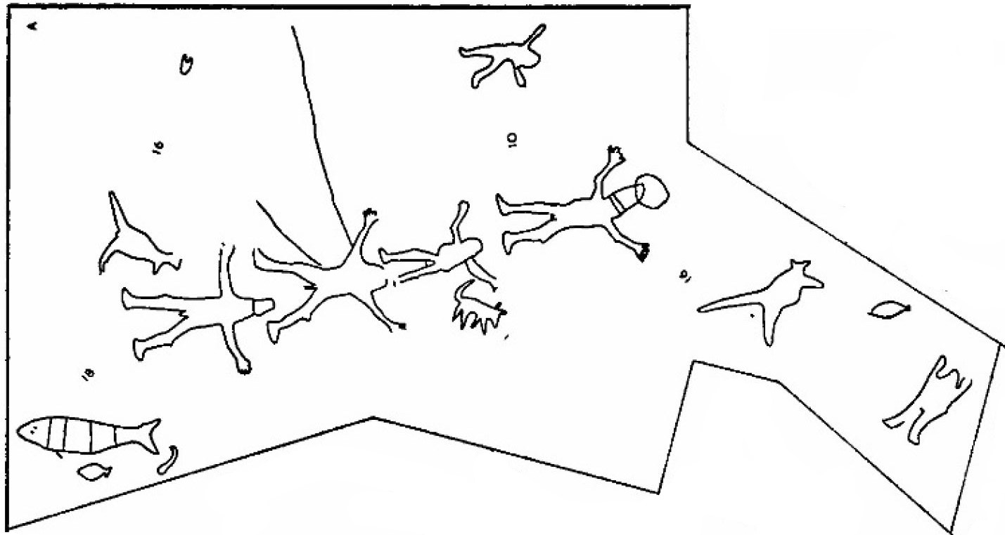 Next to the second man from the top is a dingo: “2′ long with its back to him, and it has a conical head and face, no eyes, 2 ears wide apart, convex back”.