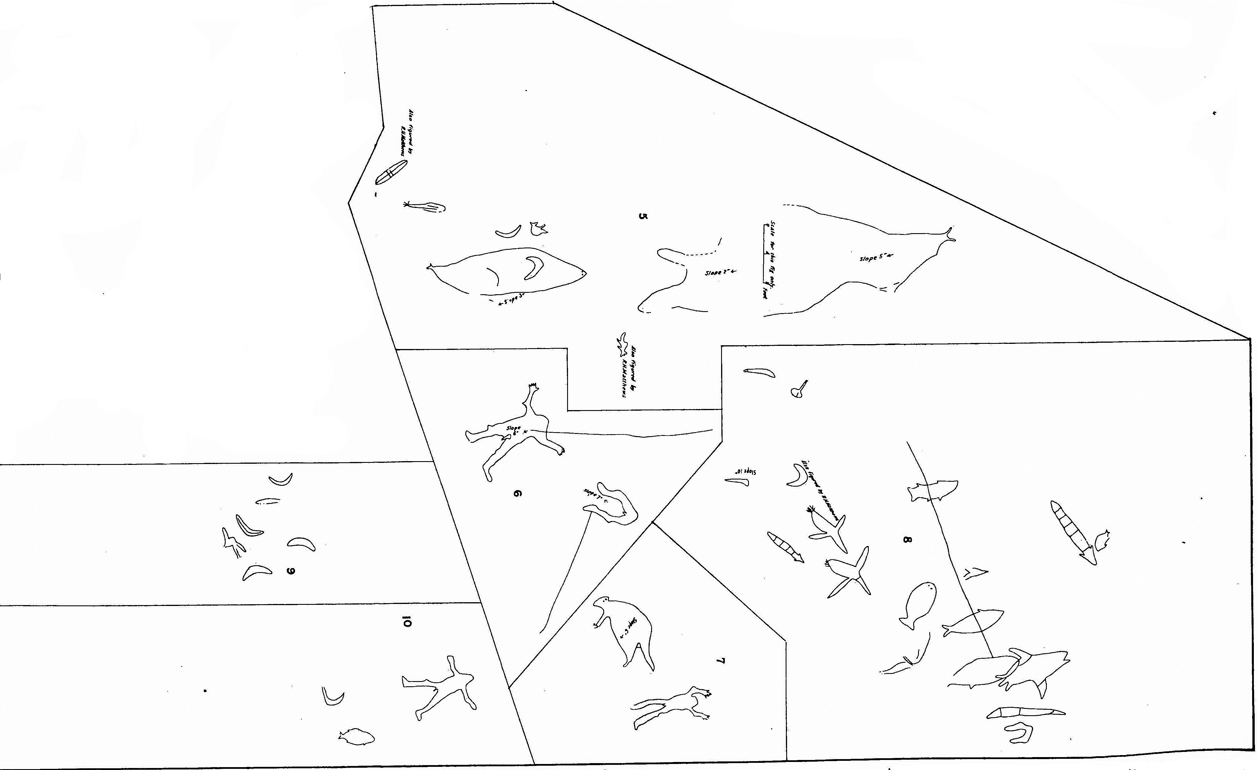 A complex Aboriginal engraving site with 42 figures first documented by W.D. Campbell in six groups. The figures include a speared man and many animals and hunting tools.