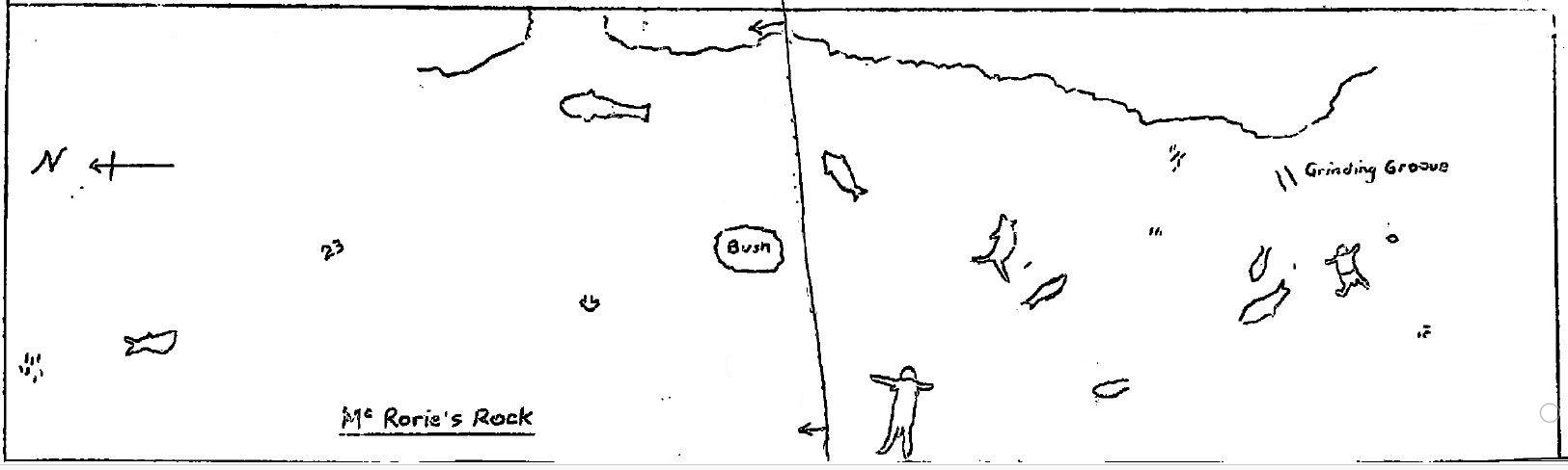 An intriguing Aboriginal engraving site near Alison's Cascades, which has two birds, a shark and a long line of mundoes.